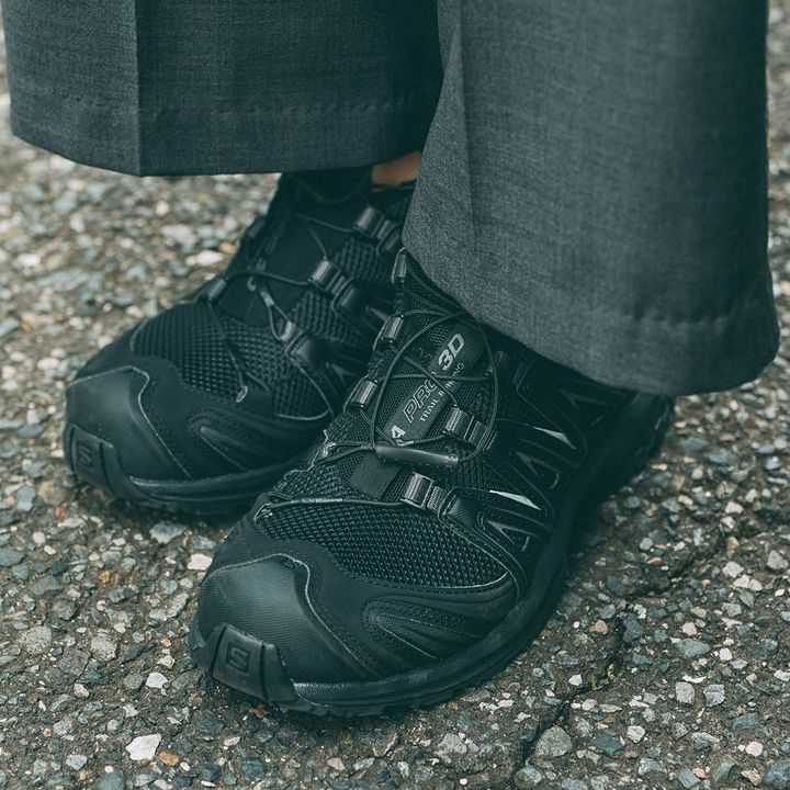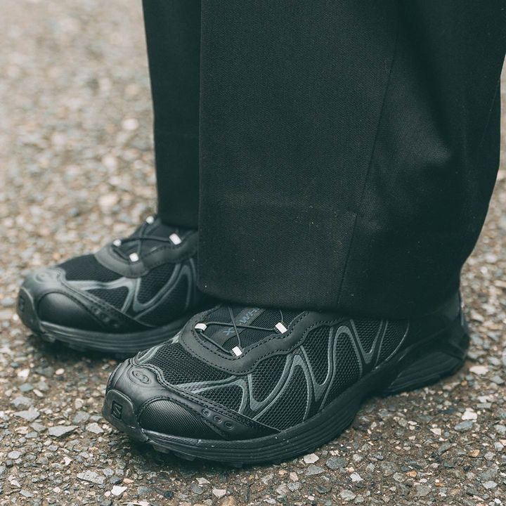 足元は『サロモン』のオールブラックシューズをオン! ゴツめデザインで、ファーアウターの甘さを程よく中和。