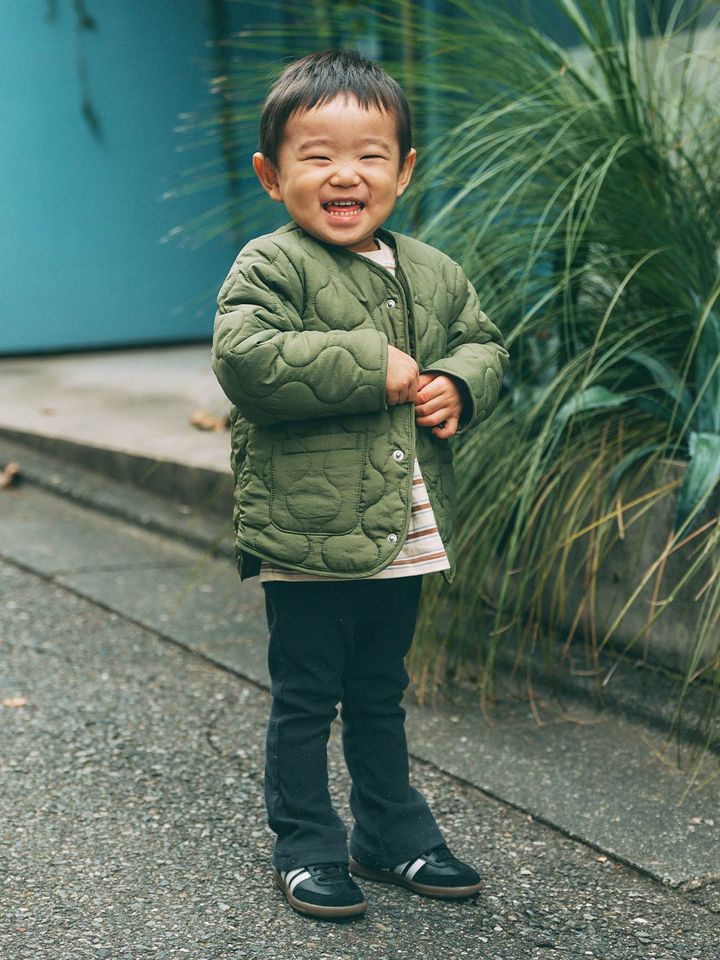 カーキのキルティングアウターにブラウンのボーダートップスを合わせたカジュアルコーデ。ボトムスとシューズはブラックにしてかっこよく。
