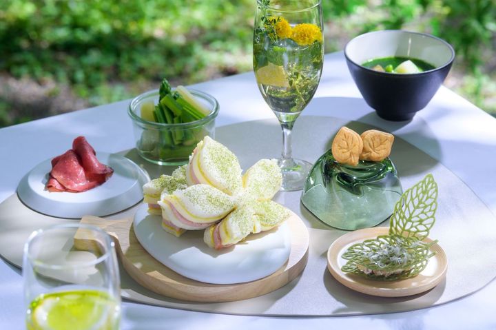 「芽吹きピクニックランチ」は、奥入瀬渓流に生育する100種類の樹木のなかから特徴的な3種を選んで、それぞれの芽吹きの形状や質感を表現しています。メニューは、軽やかな風味と色彩にこだわったサンドイッチ、スナック、クッキーなどなど。どれも新緑の季節のさわやかさを感じることができます。