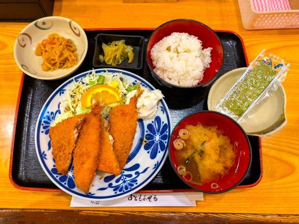 アジフライ2枚に小鉢、お味噌汁、味海苔、ご飯大盛り無料で、850円