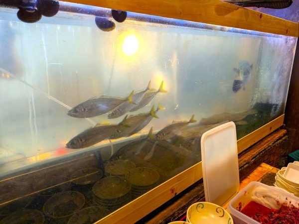 店内には、水槽があり、活きの良い魚がその場で味わえるなんて、いいですね~。また、ガシラ・カワハギ・アジ・平目などの新鮮な魚介類を毎日仕入れられていて、旬のお魚がリーズナブルな価格で楽しめる仕組みになっています。