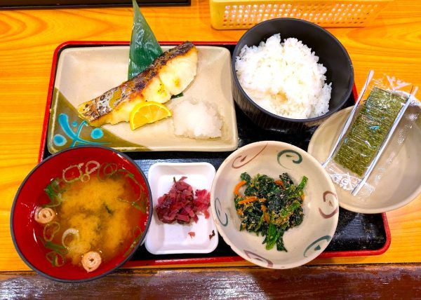 焼魚定食 830円 焼魚定食は、メインのサワラの西京焼きに、小鉢(ほうれん草の胡麻和え)、漬物、お味噌汁、味海苔、ご飯付きです。ご飯の大盛り無料です。ご飯がおいしいです。お盆からおかずがはみ出しています。