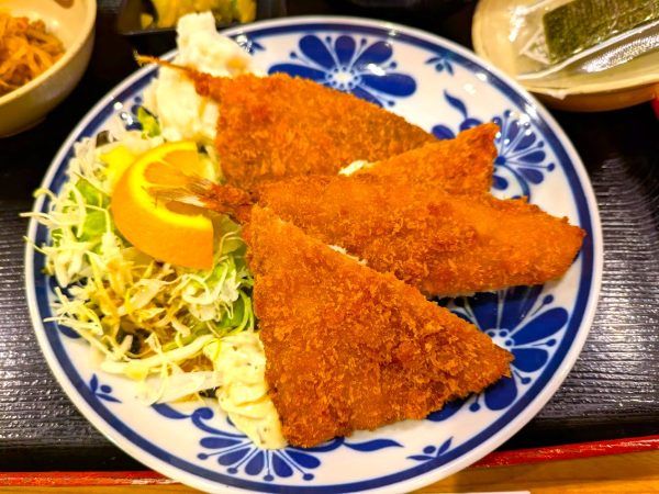 ザクっとサクッとした衣が心地よい大きな黄金色のアジフライです。大きなアジフライが2枚、合計4切れ。キャベツとレタスのサラダとポテトサラダが添えてあります。お腹いっぱいになりますね~。