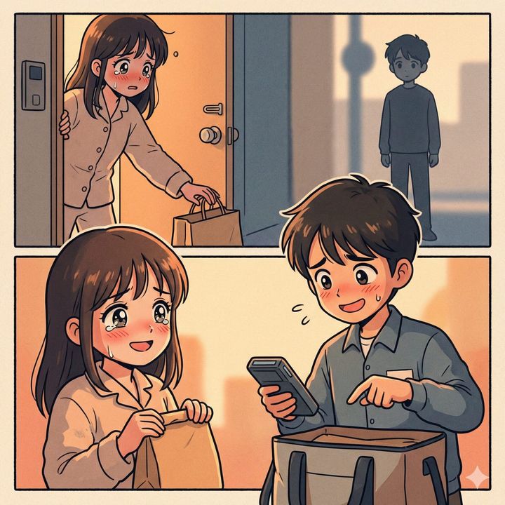 「あ、すみません!驚かせてしまいましたよね。私、さっきの配達員です」
