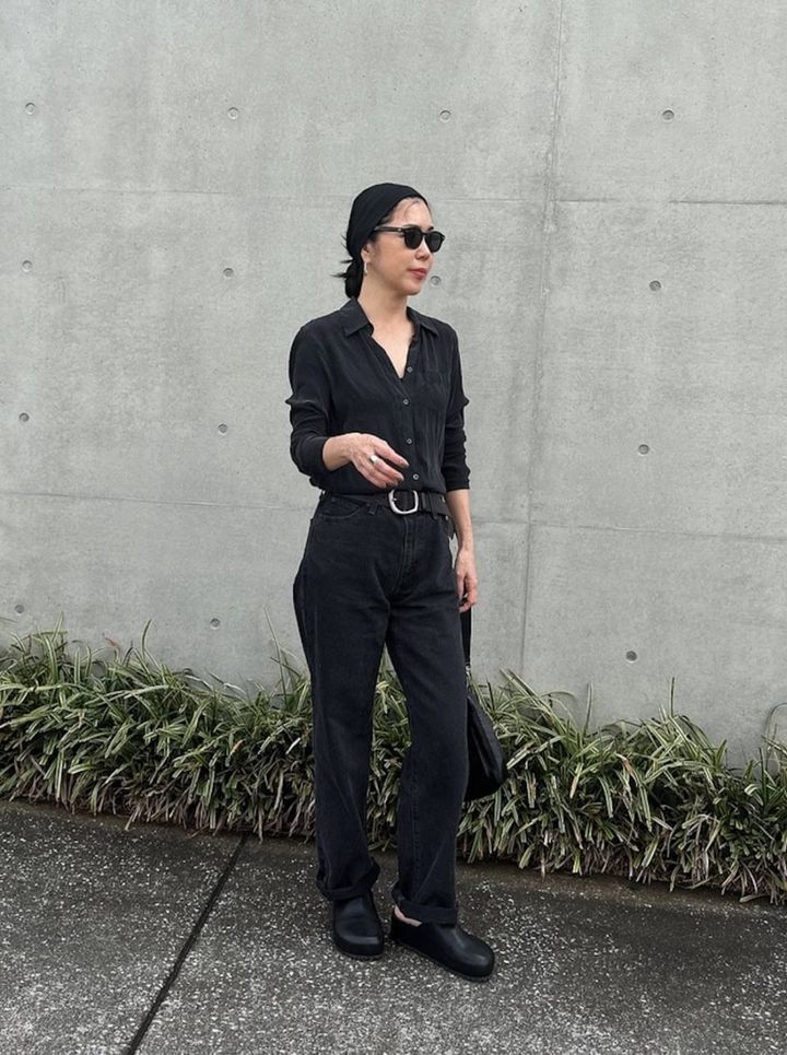 ラフなデニムスタイルも、オールブラックならグッとスタイリッシュに。カジュアルになり過ぎないポイントはこなれ感のあるシルクのシャツ。着こなしにエレガントさが加わって◎。