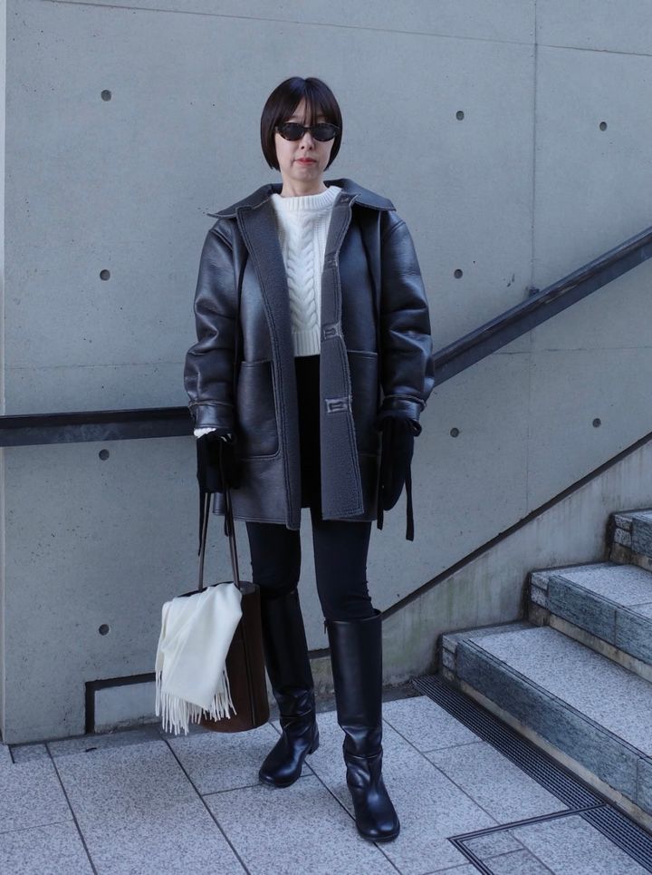 何気なくバッグにかけた白いストールが、コーデのバランスを整えるキーアイテム! ブーツインでスッキリまとめたボトムに、素材感のあるムートンコートのコントラストが素敵です。