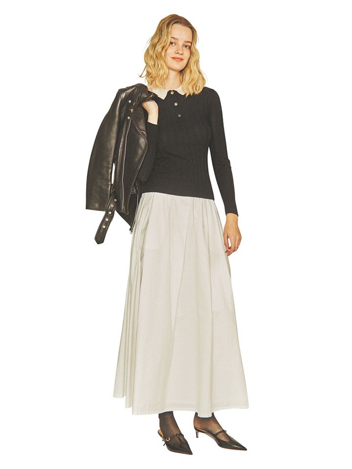 【POINT】黒ニットのえりだけ白くした、ひかえめなひとクセで淑女にふるまう日も堅苦しさはなし。首元だけ浮かないよう、スカートとカラーリンク。スカートには裏地がついているため、インナーが透けにくい。