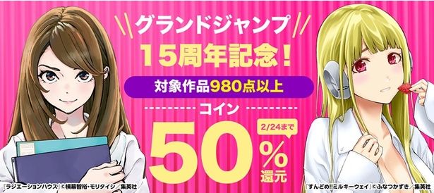 「BOOK☆WALKER」では、2月20日(金)~2月24日(火)の期間、グランドジャンプ15周年を記念した50%コイン還元キャンペーンが開催中!対象となるのは人気タイトルの『ラジエーションハウス』、『adabana-徒花-』、『Shrink~精神科医ヨワイ~』、『霊媒師いずな Ascension』をはじめ、『怨み屋本舗WORST』など“怨み屋”数シリーズ、『BLACK TIGER ブラックティガー』など980作品以上。さらに、『ドラフトキング』や『セレブるカップル』などはセールで一部33円(税込)に!