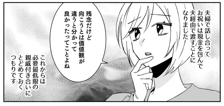 どんなに説明してもこちらの考えはわかってくれそうもなく、これ以上話していても時間の無駄だと思い「今後は、そういうつもりでお付き合いをしていきますので!」そう言って私は電話を切りました。帰宅した夫にも事情を話しましたが、私の考えに理解を示してくれたのでホッとしました。