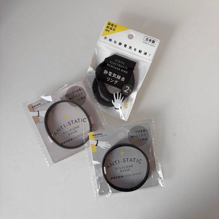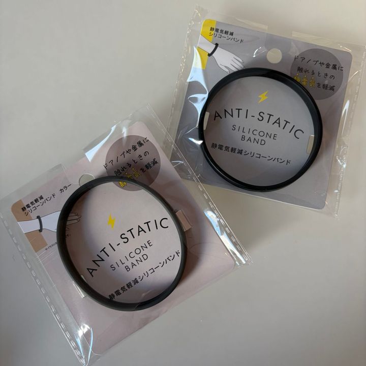 静電気除去リングは太めのものだとより静電気を感じにくいそうなんですが、このシリコンリングは割としっかり太めでよかったです!カラーも黒、グレー、ピンクと豊富で、バチッとするこの時期に大活躍です♪※静電気除去リング、静電気軽減シリコンバンド、共にセリアで110円