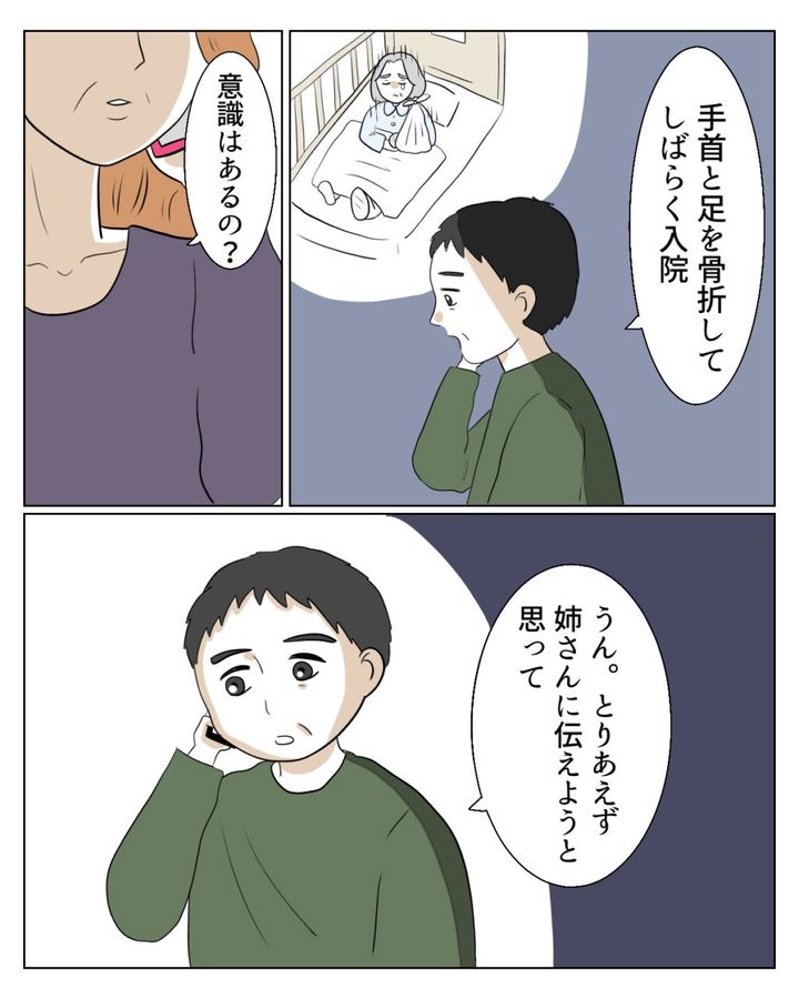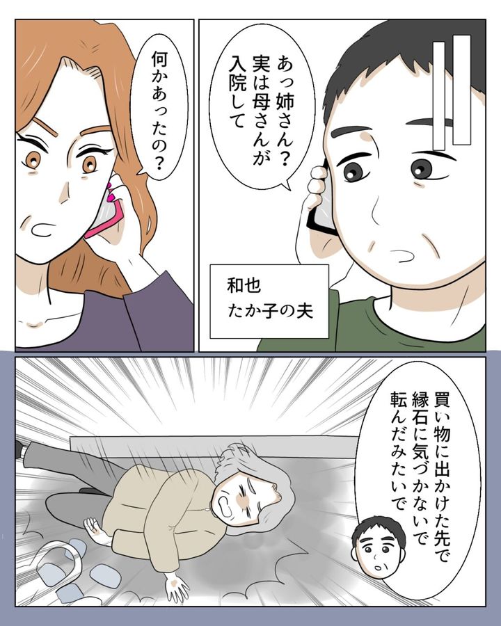 そんなある日、思いもよらない事件が起こります。義母がスーパーへ出かけた際、縁石に気づかず転倒してしまったのです。倒れている義母を見た店員さんが救急車を呼んでくれ、長男である和也さんのもとに連絡が入りました。ひと通りの手続きを終えて落ち着いたあと、和也さんは義姉のエミさんに連絡を入れることにしました。