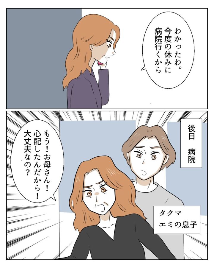 義母が無事だと分かると、エミさんは「わかったわ、今度の休みに病院行くから」と告げて電話を切りました。後日、義母が入院している病院に、エミさんは息子のタクマさんを連れてお見舞いにやってきました。「もう!お母さん、心配したんだから!大丈夫なの?」と大げさに声を上げながら、病室に入ってきます。