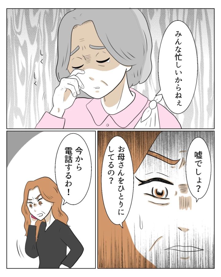 義母は「みんな忙しいからねぇ」と言ったかと思うと、堪えきれずに泣き出してしまいました。その姿を見たエミさんは「噓でしょ?お母さんをひとりにしてるの?」と声を震わせます。怒りをにじませた表情のままスマホを取り出すと、和也さんに電話をかけ始めたのでした。