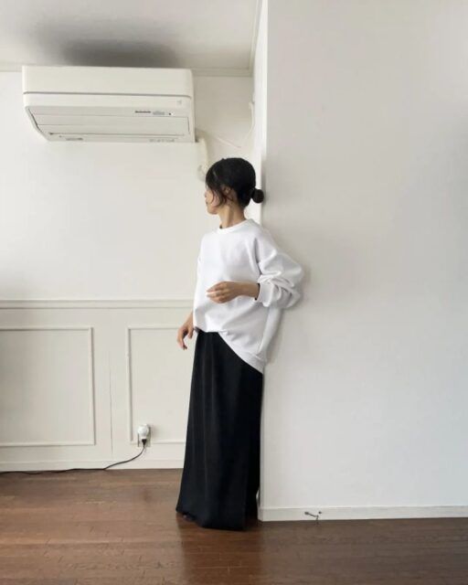 「黒or白スウェット」は大人世代のワンマイルウェアにもってこい。スウェットはカジュアルになりがちですが、モノトーンカラーで取り入れることで大人っぽさが加わり、50代のご近所コーデにハマります。