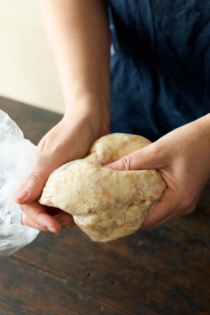 厚揚げはAとともにポリ袋に入れ、袋の上から手でもみ混ぜる。全体がなじんだら8 等分にして丸め、かるく押さえて平らにする。