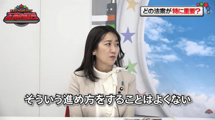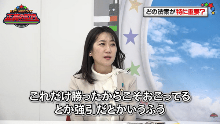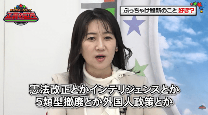 「ただ一方で国政では、与党のパートナーとして価値観的にはずっと自民党が本丸としてやりたいと思ってたことを一緒にできそうだなっていう。憲法改正とか、インテリジェンスとか、5類型撤廃とか、外国人政策とか」