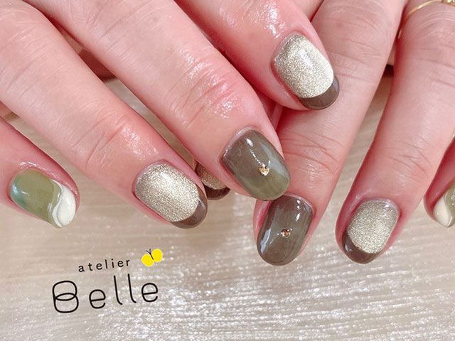 【大人ニュアンスネイル】カーキカラーとマグネットで魅せる上品な指先