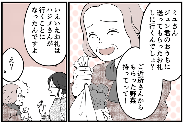 私は「夫が帰ってきたら行くと思います」と答えました。しかし、義母は近所の人からもらったという野菜を差し出し、「これをお礼に持っていきなさい」と言いました。義母は昔ながらの考え方で、こういうときは母親が動くものだと思っています。