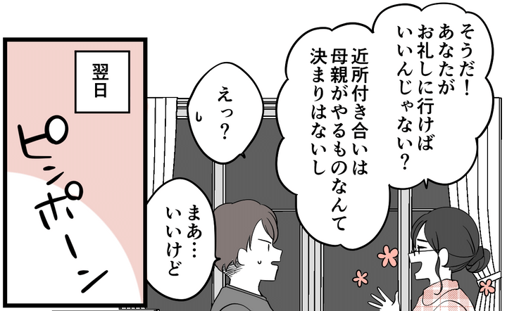 私は「持ちつ持たれつだからお礼はいらない」と言ったのに、夫が行くと言うからそれならそれでいいと思いました。