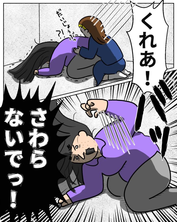 「くれあ!大丈夫!?」そう言って愛花がくれあの体に触れようとした瞬間、くれあはものすごい勢いでその手を振り払い、「さわらないでっ!」と叫びました。久しぶりに見たくれあは、まるで別人のようでした。髪や肌は荒れ、部屋にこもりきりだったせいか体つきまで変わって見えます。