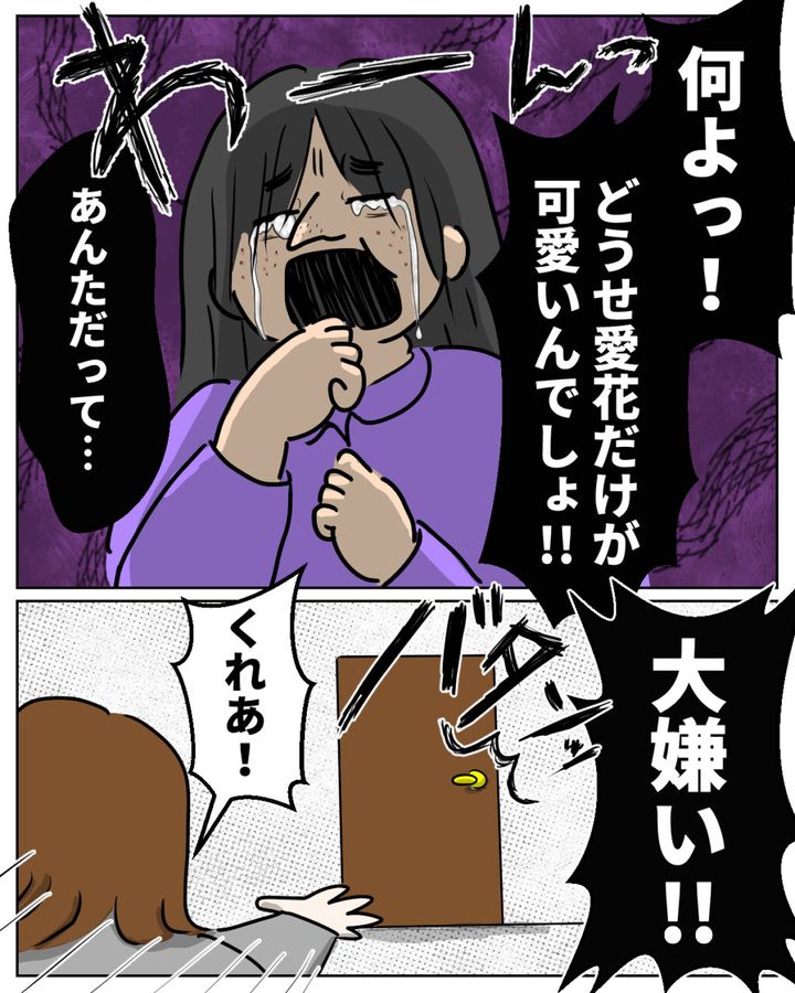 くれあは声をあげて泣きながら、「何よっ!どうせ愛花だけが可愛いんでしょ!あんただって大嫌い!」そう吐き捨てると、再び部屋に閉じこもってしまいました。
