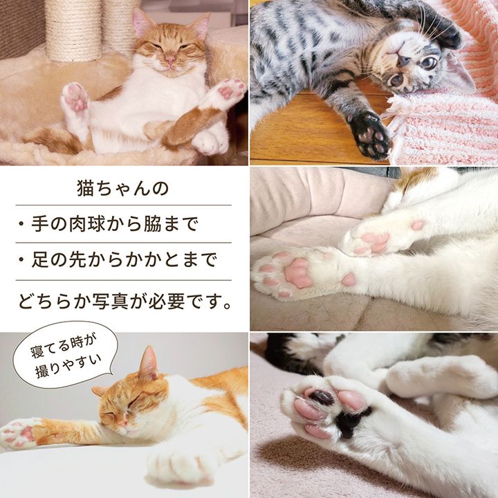 オーダーに必要なのは、猫ちゃんの「手の肉球から脇まで」「足の先からかかとまで」のいずれかの写真。つまり前脚か後脚の肉球全景と肘もしくはかかとまでの写真であります。