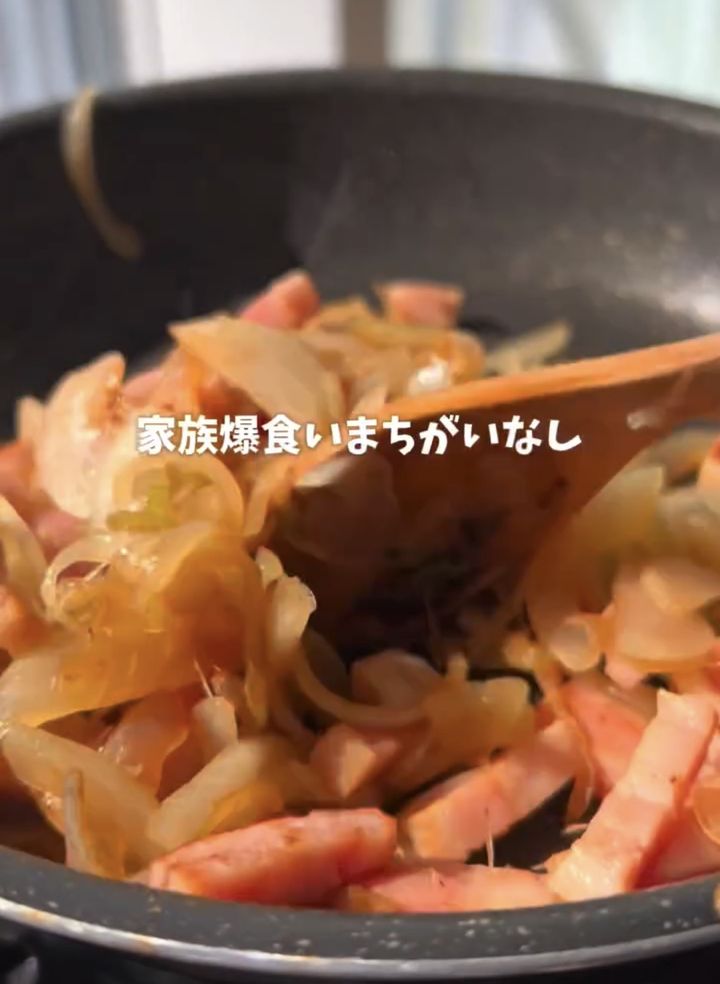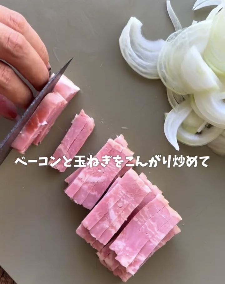 玉ねぎが甘みを増し、ベーコンがこんがりと色づいていく。フライパンから聞こえるリズミカルな音と、立ち上る香ばしい香りに、作る側のテンションも自然と上がります (笑)。