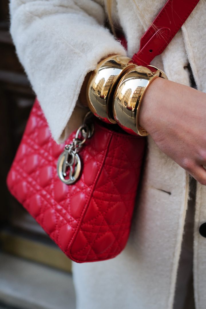 コーデが華やぐルビーカラーの“レディ ディオール”がステラのエッセンシャルアイテム。ボリューミーなバングルの重ね着けで、モダンな輝きを後押し。