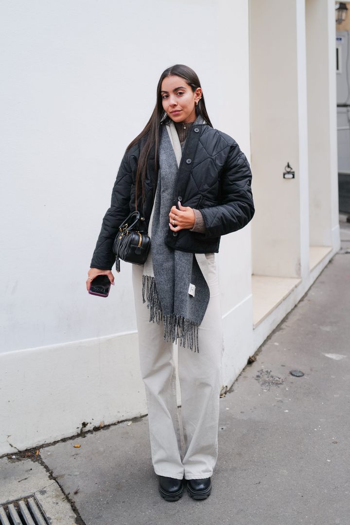 重くなりがちな冬のモノトーンコーデは、ボトムスを白にスイッチして軽やかさをオン。コンパクトなパフジャケット、「ミュウミュウ」のバッグ“アルカディ”など、カジュアルコーデをきれいめにまとめるアイテム選びもコーデの肝。