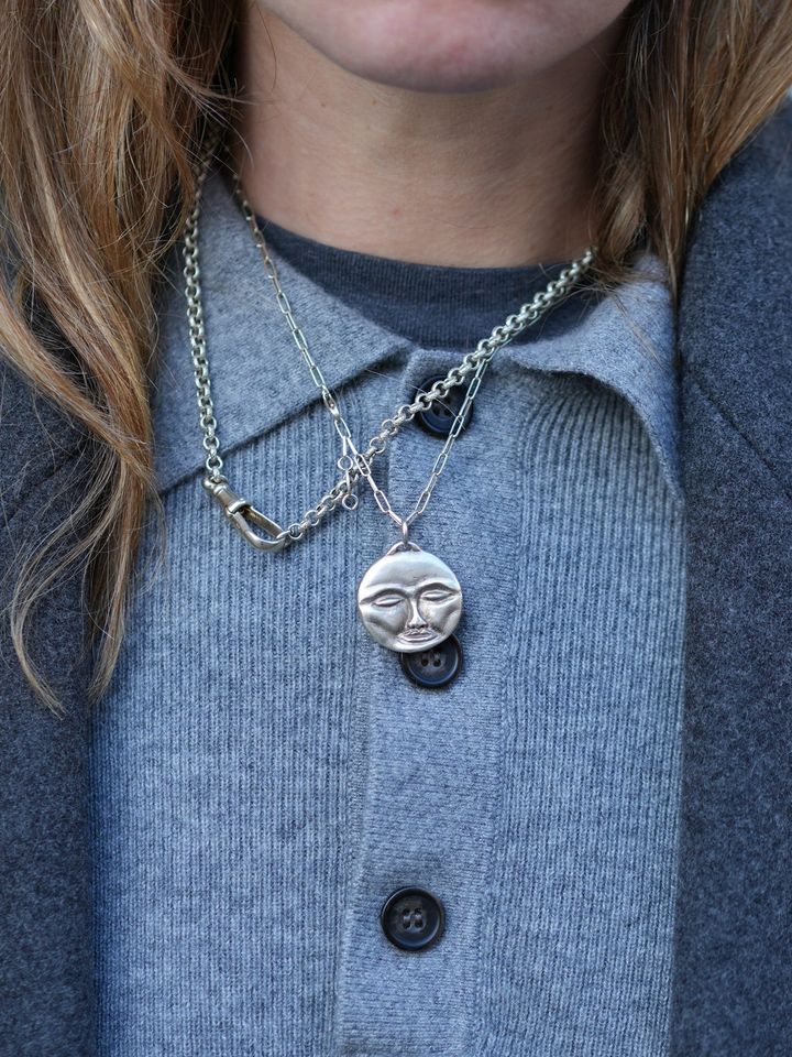 ニットにはシルバーネックレスのレイヤードで輝きをのせて。チャーミングなフェイスチャームで遊び心もオン。