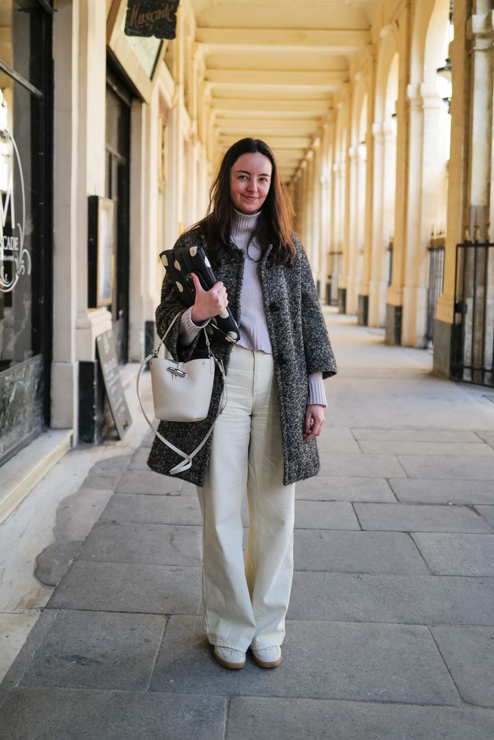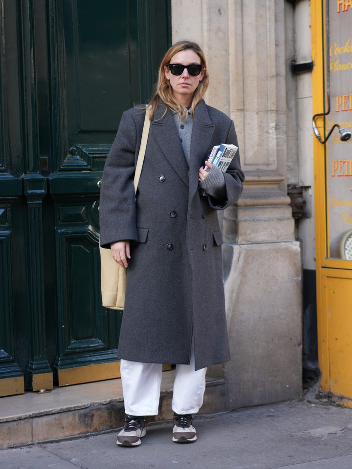 ドーヴィルの愛用アウターは、ダークグレーのロングコート。オーセンティックな一着には、白デニムで抜け感を出して着こなすのが彼女の定番ルール。ミニマルなベージュバッグやシックなカラーブロックスニーカーなど、洗練された小物使いにも注目。