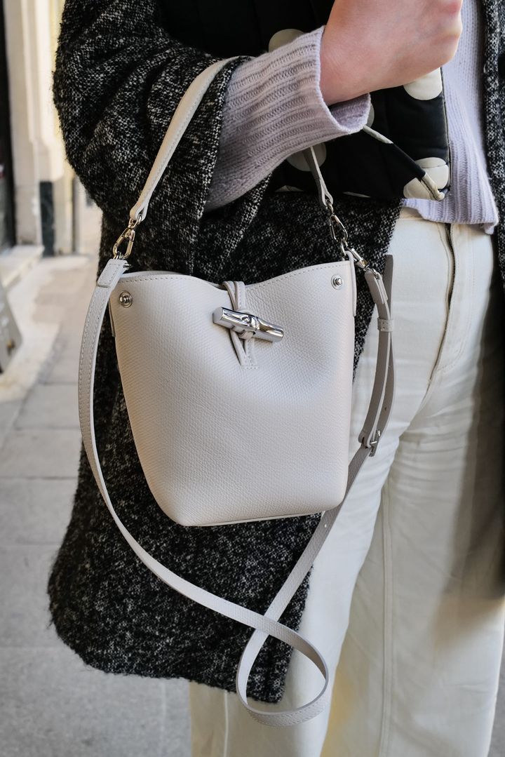 バッグは「ロンシャン」の“ル ロゾ”を合わせて。シルバーのバンブークラスプがアクセントになった、上品なバケット形バッグが着こなしに似合う。