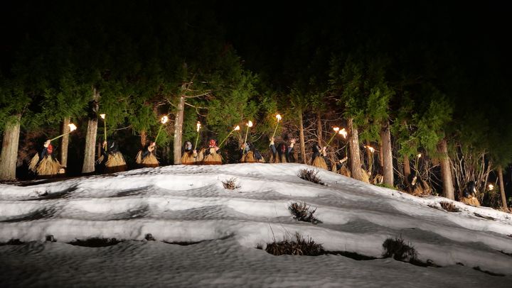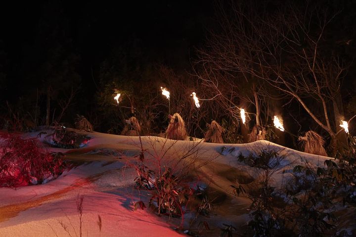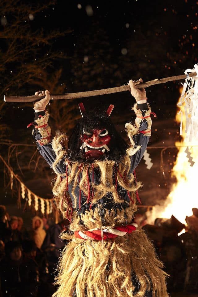 「なまはげ踊り」。なまはげ柴灯まつりは、900年以上前から毎年1月3日に真山神社で行われている神事「柴灯祭(さいとうさい)」と、民俗行事「なまはげ」を組み合わせた冬の観光行事