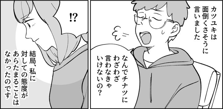 カツユキはケントに対して「お、ありがとう!」「ごめんな、すぐに直すから」などと声をかけるようになりました。だから私は嬉しかったのです。けれど……結局、私に対する対応は変わりませんでした。しかも面倒くさそうに「なんでチナツにわざわざ言わなきゃいけないの?」と言ってきたのです。