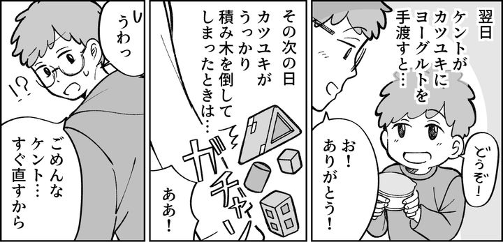 カツユキはケントに向かって積極的に「ありがとう」や「ごめんね」を言うようになりました。うんうん、いい感じ! その姿を見て、私も嬉しくなります。きちんと口に出すことの大切さをやっと理解してくれたのでしょう。ところが……?