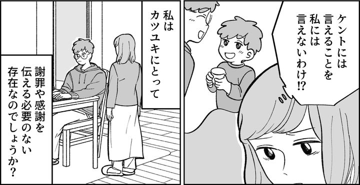 カツユキが言わないのは「私」にだけ。その事実がくっきり浮き彫りになって、私は愕然としました。私はカツユキに奉仕して当然の人間で、感謝も謝罪も必要ない存在なの……? そう思うと、なんだか虚しくなってしまったのでした。