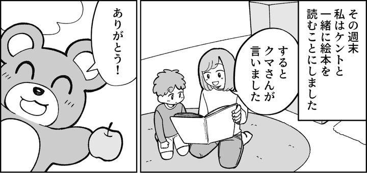 週末、私はあえてカツユキに聞こえるように絵本を読みました。クマさんが「ありがとう」と言っているシーンを見ながら、きちんと言葉にすることの大切さをケントに伝えます。そしてカツユキに向かって言いました。「私たちも親としてお手本を見せなきゃね」