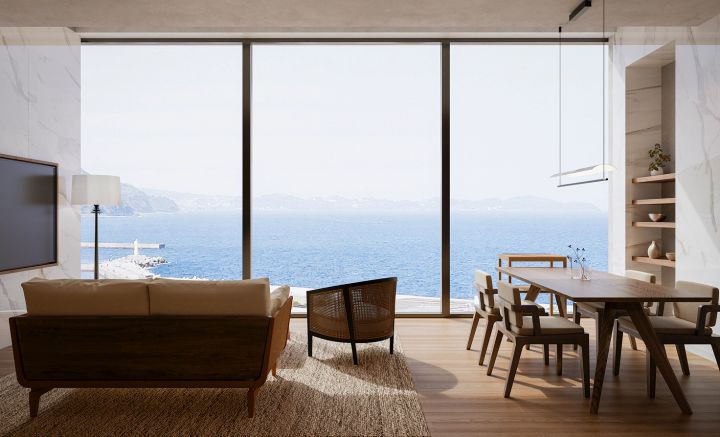 視界を遮るものが少ない環境で、水平線と空が溶け合う景色を日常に取り込む設計が構想されています。