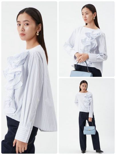 まるで自分が花になったような、とっておきの華やかさを表現したブラウス。二の腕カバー効果のあるボリュームスリーブは、肩を落としてオフショルダーとしても楽しめます。