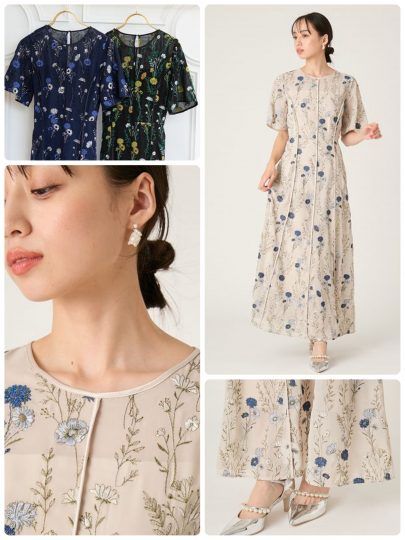 シフォン生地に光沢を帯びた糸でボタニカルフラワーを刺しゅうした、クチュール感漂うデザインが自慢のワンピース。縦のラインを意識した配置で、スタイルアップも狙えます。お出かけからセミオケージョンまで活躍できる一着です。