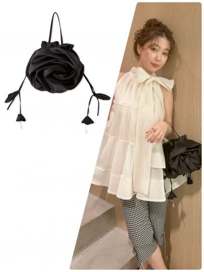 立体ローズが咲くドロストミニバッグ。ころんと丸みのあるフォルムが愛らしく、春コーデのポイントに最適。