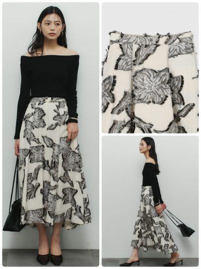 立体感のあるカットジャガード素材に、ボタニカルフラワー柄をあしらった特別感のあるスカート。さりげなく前後差がついており足元をきれいに見せてくれます。