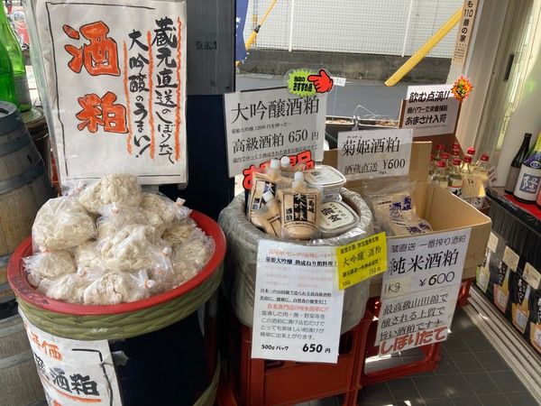 酒粕も数種類並びます。店主さんの一番のおすすめは「菊姫大吟醸酒粕」。なんと12,000円もする大吟醸を搾った酒粕です。さらに酒蔵で半年熟成されており、栄養価もUP!