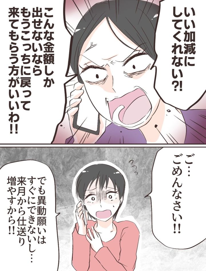 「いい加減にしてくれない!?こんな金額しか出せないなら、もうこっちに戻って来てもらう方がいいわ」電話の向こうで怒鳴り声をあげる母。実家に戻るくらいなら、仕送りを増やしたほうがマシ。そう思った私は声を震わせて「ご、ごめんなさい!でも異動願いはすぐにできないし、来月から仕送り増やすから!」と伝えました。