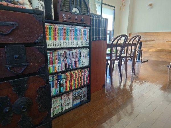 デジタルの時代ですが、本、雑誌や漫画は紙が好きな私です。お店に雑誌や本、漫画を置いてくださっていると自分的にすごく嬉しくてポイントが高くなります!レトロな可愛い棚に懐かしい漫画置いてくれていますよ。