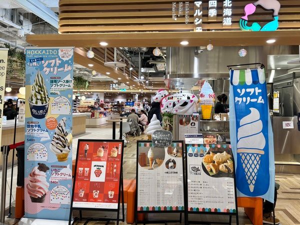 場所は地下鉄「すすきの」駅直結の商業施設「ココノススキノ」地下1階。北海道の銘菓が並ぶショップとスイーツ販売のお店が集まる「北海道四季マルシェ」の一角に、「十勝しんむら牧場 ココノススキノ店」はあります。