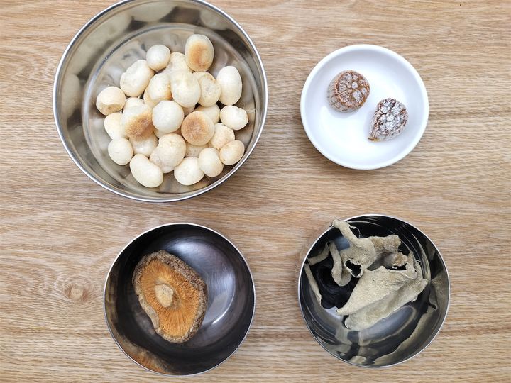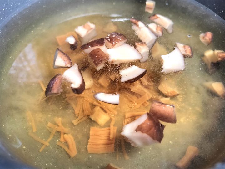 1. 鍋に干し貝柱と戻し汁、干ししいたけと戻し汁、かつおだし汁を入れて強火で沸騰させます。