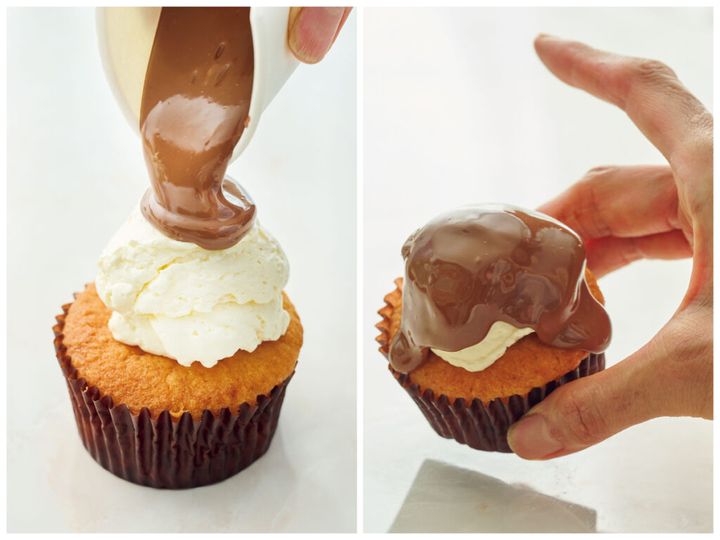 (2)口径6×高さ7.5cmくらいの紙コップに溶かしたチョコレートを入れ、1/4 量を冷やしたバタークリームの真上からかける。そのまま重力でチョコレートが落ちるのを待ちながら、カップケーキを傾けたり、底を作業台にかるくトントンと打ちつけたりして、チョ コレートを表面にいきわたらせる。残りも同様にする。