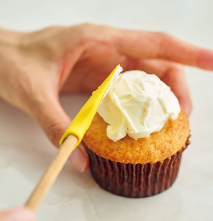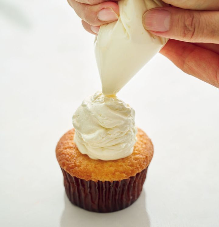 (1)厚手のポリ袋にバタークリームを入れ、一方の角を1cmほど斜めに切り落とす。クリームを切った 角に寄せ、カップケーキ1個の上に1/4量を半球状をイメージしてこんもりとのせる。