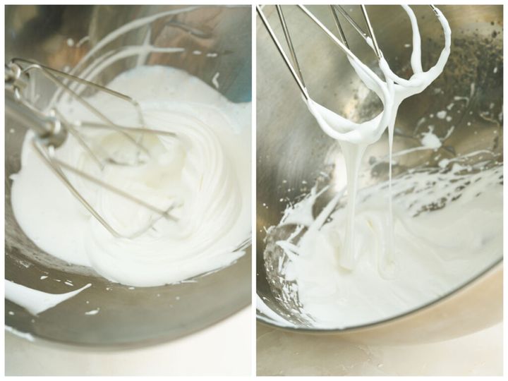 泡立て終わりの目安は、ハンドミキサーを持ち上げると、とろりと流れ落ち、手でさわっても熱くない(常温)程度。